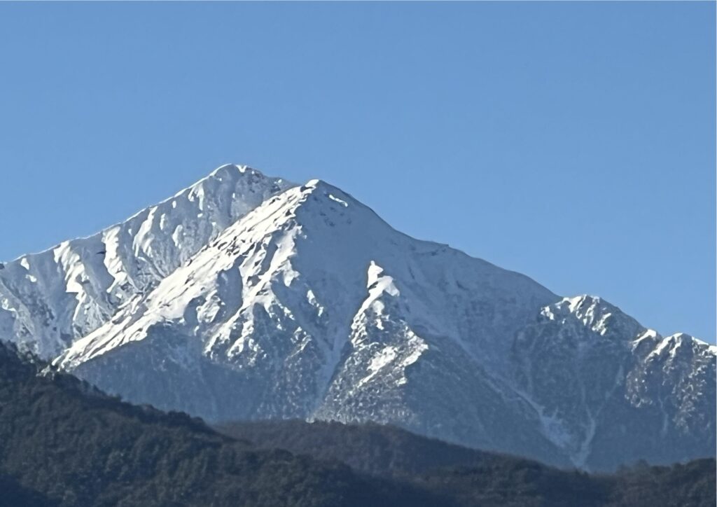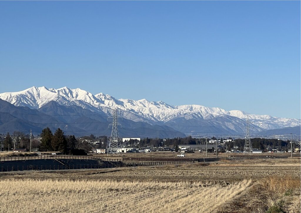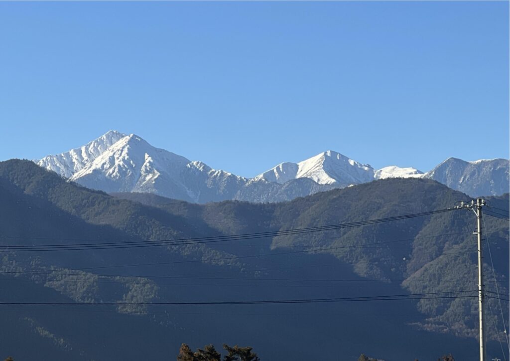 良い天気で済んだ空気の中青い空の中くっきりと浮かび上がる北アルプスが、