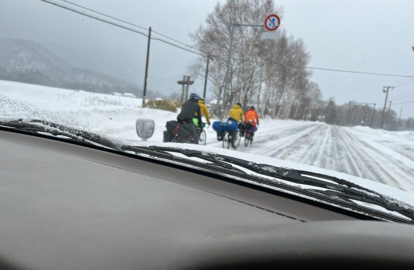 そのまま峠を下って行くと、さっきの自転車のグループが圧雪された道路の中、